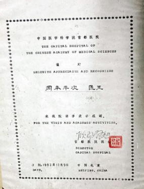 帰国前夜には、北京首都医院の陳敏章先生(後の衛生大臣)が北京飯店を訪れ、ライブデモへの厚い感謝を述べてくださった(「感謝状」をいただいた(下図)、)。痩身で日本語に堪能な紳士であり、藤田教授とも親しい間柄で、心温まる北京最後の夜となりました。